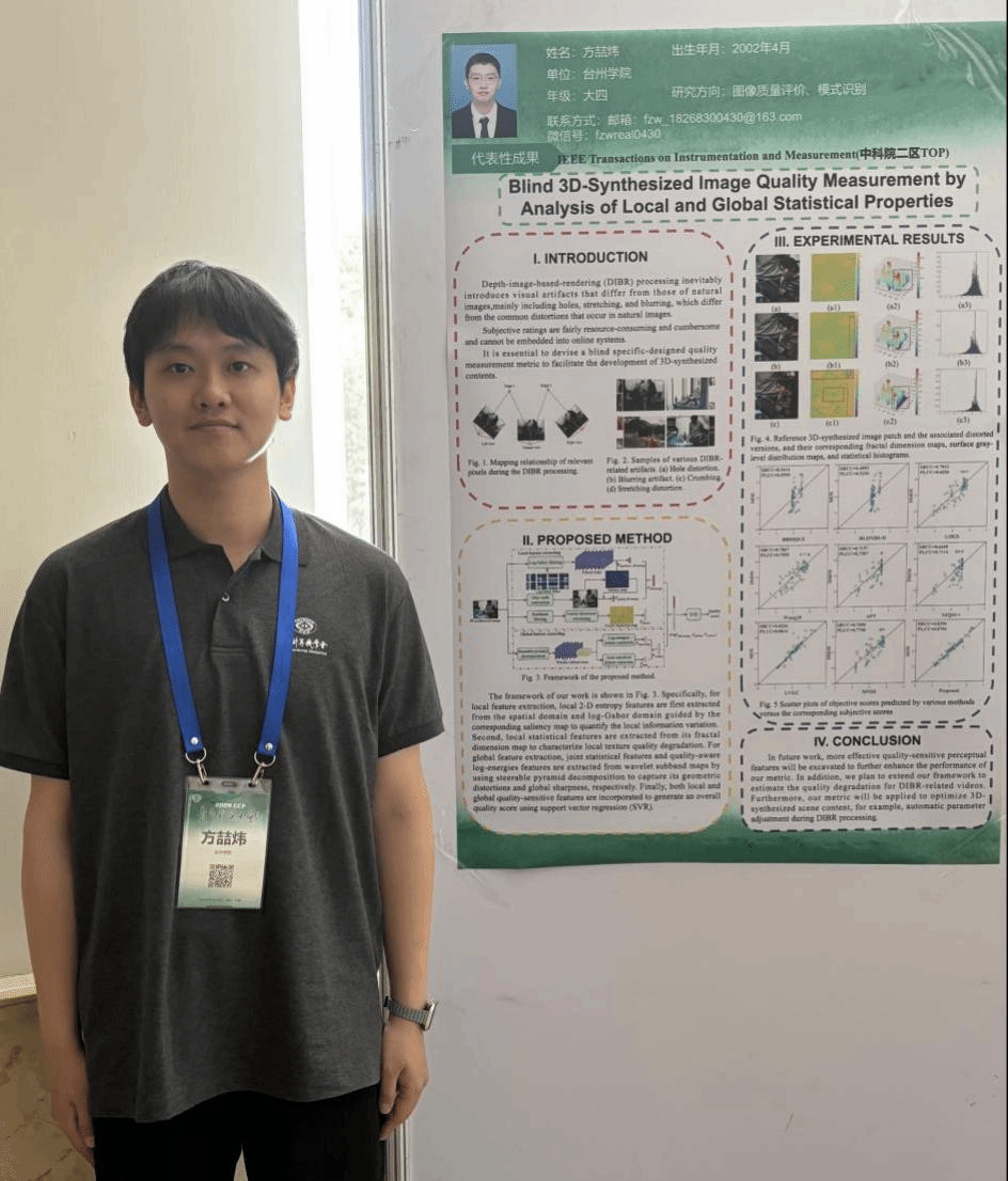 据悉,学术秀环节由来自CCF全国各地的40余名参赛选手进行学术秀展示、演讲。经过了数个小时的精彩展示和评委组独立打分评审,分别确定了博士生组、硕士生组、本科生组的评比结果,每组分别产生一等奖1名,二等奖2名。​2020级大数据专业本科生方喆炜同学在学术秀中展示并演讲了题为“Blind 3D-Synthesized Image Quality Measurement by Analysis of Local and Global Statistical Properties”的最新研究成果,该成果发表在国际TOP期刊《IEEE Transactions on Instrumentation and Measurement》,指导教师和通讯作者为崔跃利博士。最终,在“老员工学术秀”中获得本科组二等奖,展现了台院学子的风采,获得专家和评委们的一致好评。据悉,这是国内获奖的唯一非“985”、“211”、“双一流”高校,浙江省内唯一获奖高校,为公司赢得了良好的声誉。