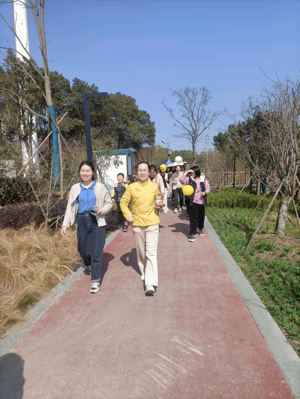 初春的灵湖岸边、金洋湿地公园处处生机盎然。簇簇盛放的花朵、微吐新芽的柳枝、碧波荡漾的湖水,大家三三两两结伴,漫步在如诗如画般的美景里,边欣赏沿途风光,边谈笑风生,好不惬意。