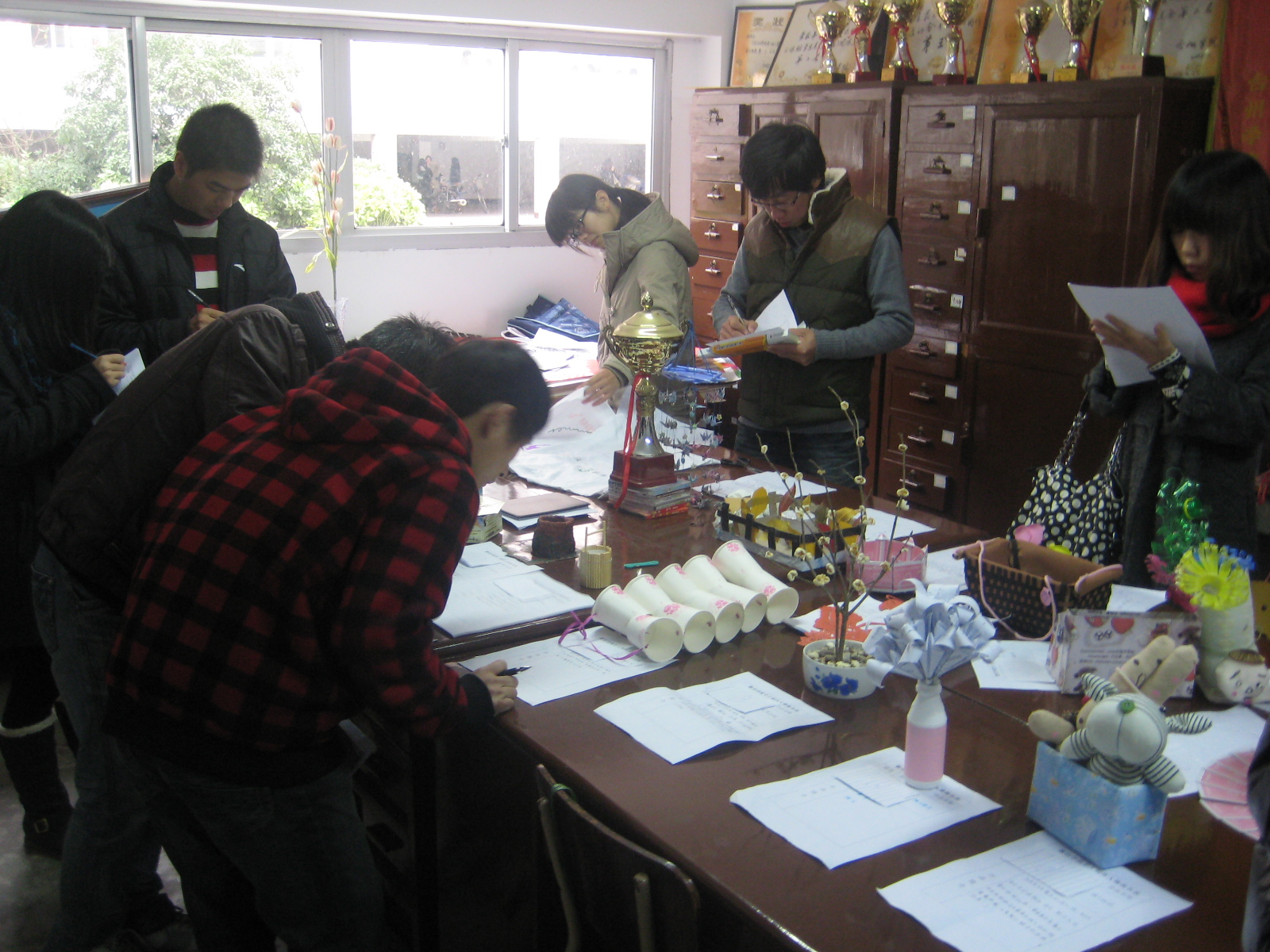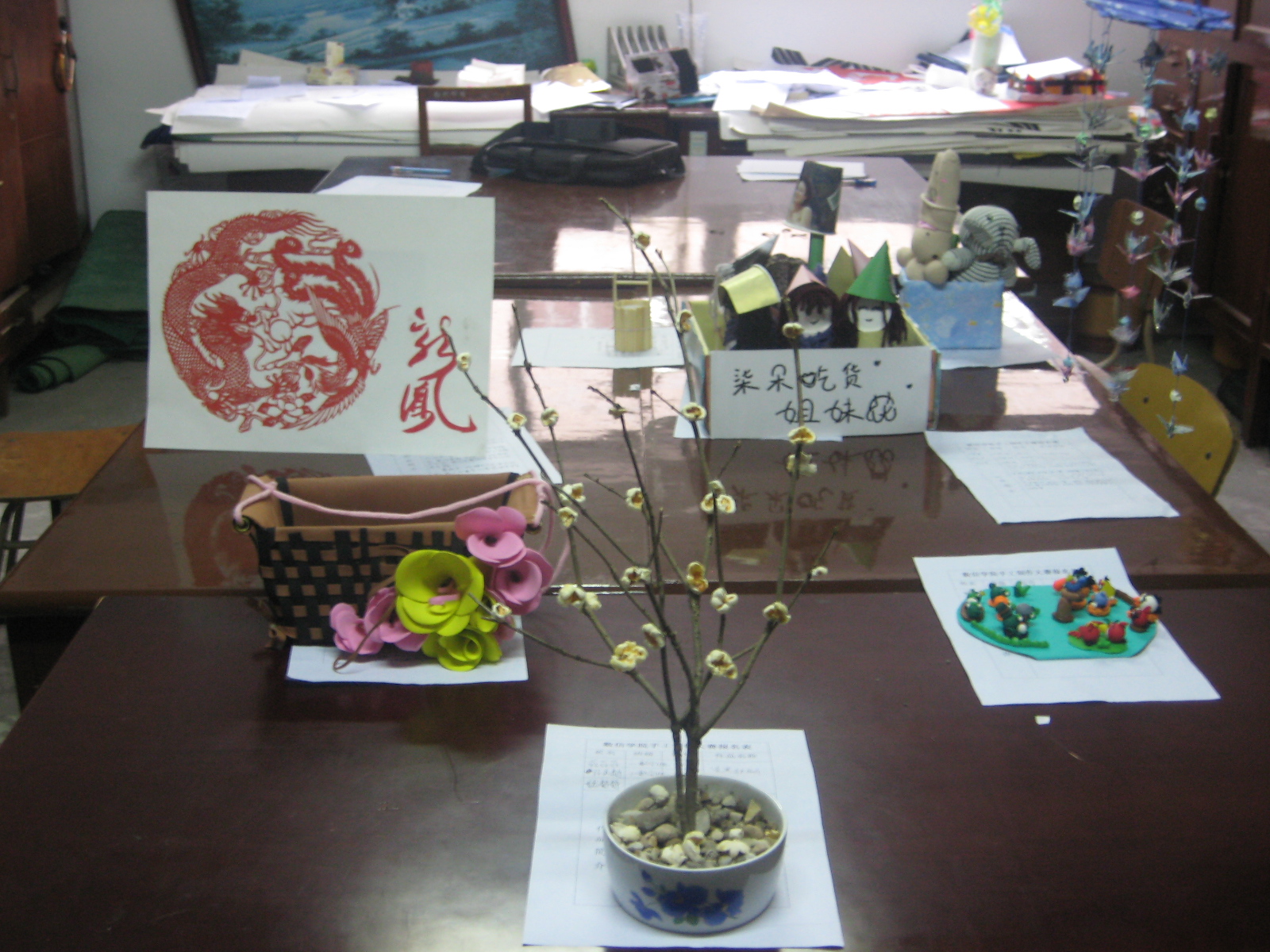 公司团学会办公室里摆放着各式各样的手工艺参赛作品,每件参赛作品都创意新颖,手工精美。一盆“凌寒独自开”的寒梅首夺评委的眼球。它是由吃剩的爆米花,嫌弃的小花盆,干枯的树枝及路边的小石子制作而成,融入了环保、创意等元素,构思巧妙,美观大方,获得了一等奖。此外,“我也是花”,“Angry Birds DIY软陶公仔系列”获得二等奖,获得三等奖的是“笑脸娃娃”、“风色幻xiang”及“龙凤”剪纸。