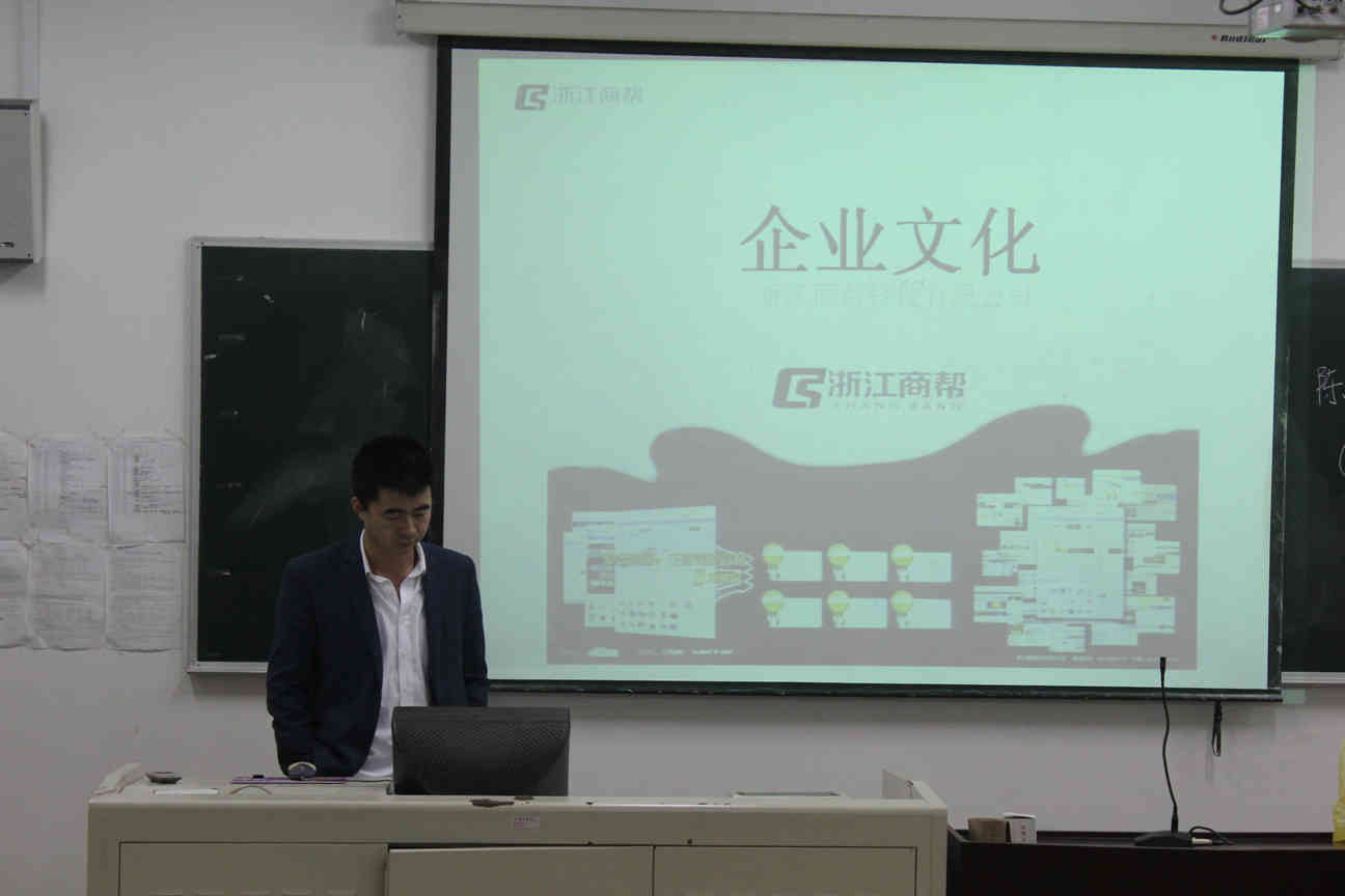 浙江商帮科技有限公司市场部总监陈小华先生结合PPT,深情并茂的向同学们介绍了公司的发展历程、独特的企业文化、良好的发展前景、轻松的工作氛围以及丰富的员工福利。陈小华先生表示在招收员工方面,先重其品德,再重其能力并表示欢迎数信学子踊跃加入。同时,10届信管班长金胜林也向同学们介绍了自己在公司实习的经历。深化了员工对公司良好印象。