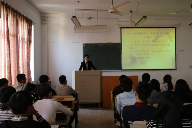 培训会由团学会组织部副部长金鑫主持,分为三个议程进行。张鹏老师以《团学漫谈》为主题首先发表讲话,就学习、素养、工作态度、创新四方面对“如何做一名优秀的员工干部”进行解说,期间更结合具体事例进行分析。同时要求团学会成员树立“为同学服务”的宗旨,发挥模范带头作用。紧接着13届团学会办公室主任黄梦婷同学针对通知、会议、值班三种情况下的礼仪进行说明。培训会最后,团学会主席刘鑫同学对各干部干事提出要善于保持乐观向上的学习、工作、生活态度等要求。