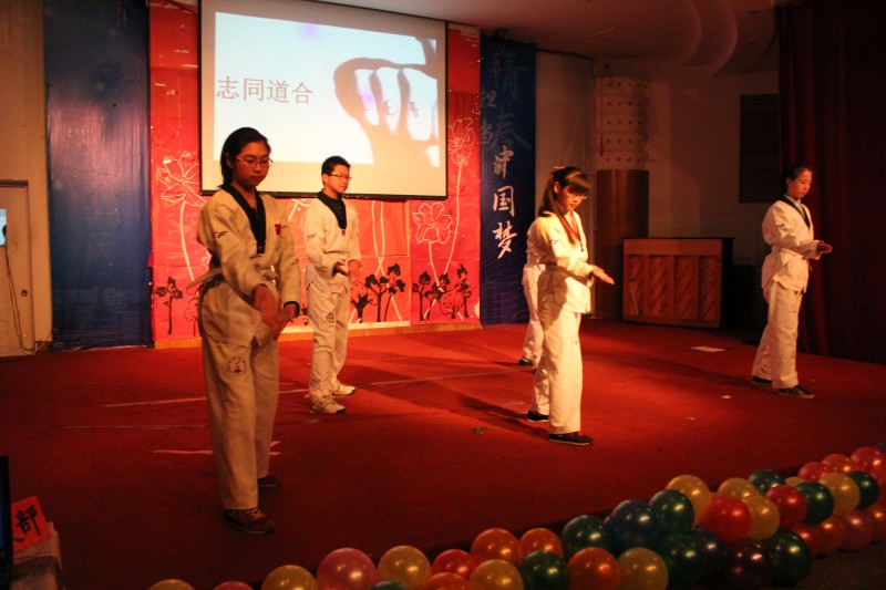 整场晚会的节目都由团学会成员自编自导自演而成。晚会上,作为开场秀的舞蹈《活力四部》赚足了眼球,人手两根大蒜和反串跳起了甩葱舞,引起台下阵阵爆笑。小品《悲与喜》凭借幽默搞笑的表演再次将现场气氛推向高潮。跆拳道表演《志同道合》,三位女将的手劈木板,跳前踢木板以强大的气场效应博得阵阵叫好声。而穿插在节目中的《喝可乐》、《数数字》以及《大冒险》等游戏使得台上台下互动频繁,融为一体。最后,晚会在抽读现场人员的祝福语中落下帷幕。现场氛围温馨和谐,有如一家欢聚。