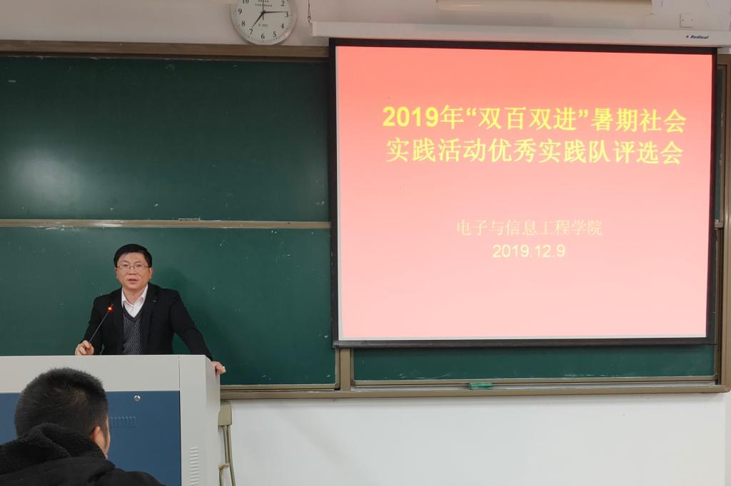 VSport体育于12月9日晚在2202教室举行2019年“双百双进”暑期社会实践活动优秀实践队评选会。公司党总支副书记冯荣、辅导员周吉、沈迪及各实践队代表、各班员工参加交流会。