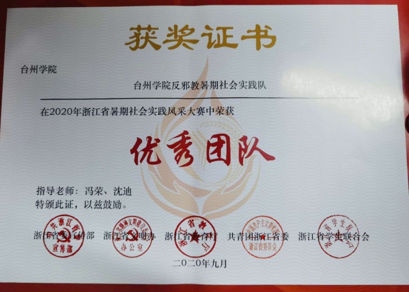 近日,省委宣传部、省文明办、省教育厅、团省委等部门公布2020年浙江省暑期社会实践风采大赛评奖结果,公司公司党总支副书记冯荣、辅导员沈迪指导的反邪教协会暑期社会实践队再获佳绩,荣获“优秀团队”称号。