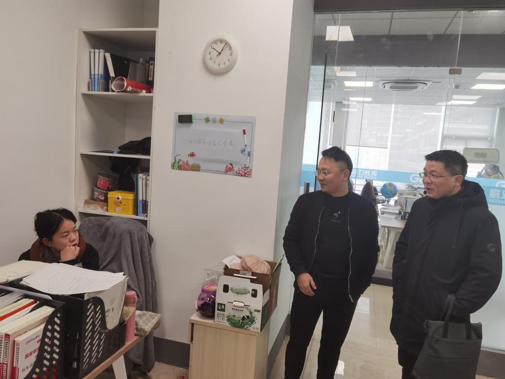 为了进一步加强与用人单位的联系,深入了解用人单位的招聘需求,提高毕业生留台率,2021年1月11日,电信公司党总支副书记冯荣带队前往给力教育集团温岭分校进行实地考察,看望在那工作的公司员工,并与该校董事长刘佩龙等进行深入交流。公司辅导员沈迪陪同调研。