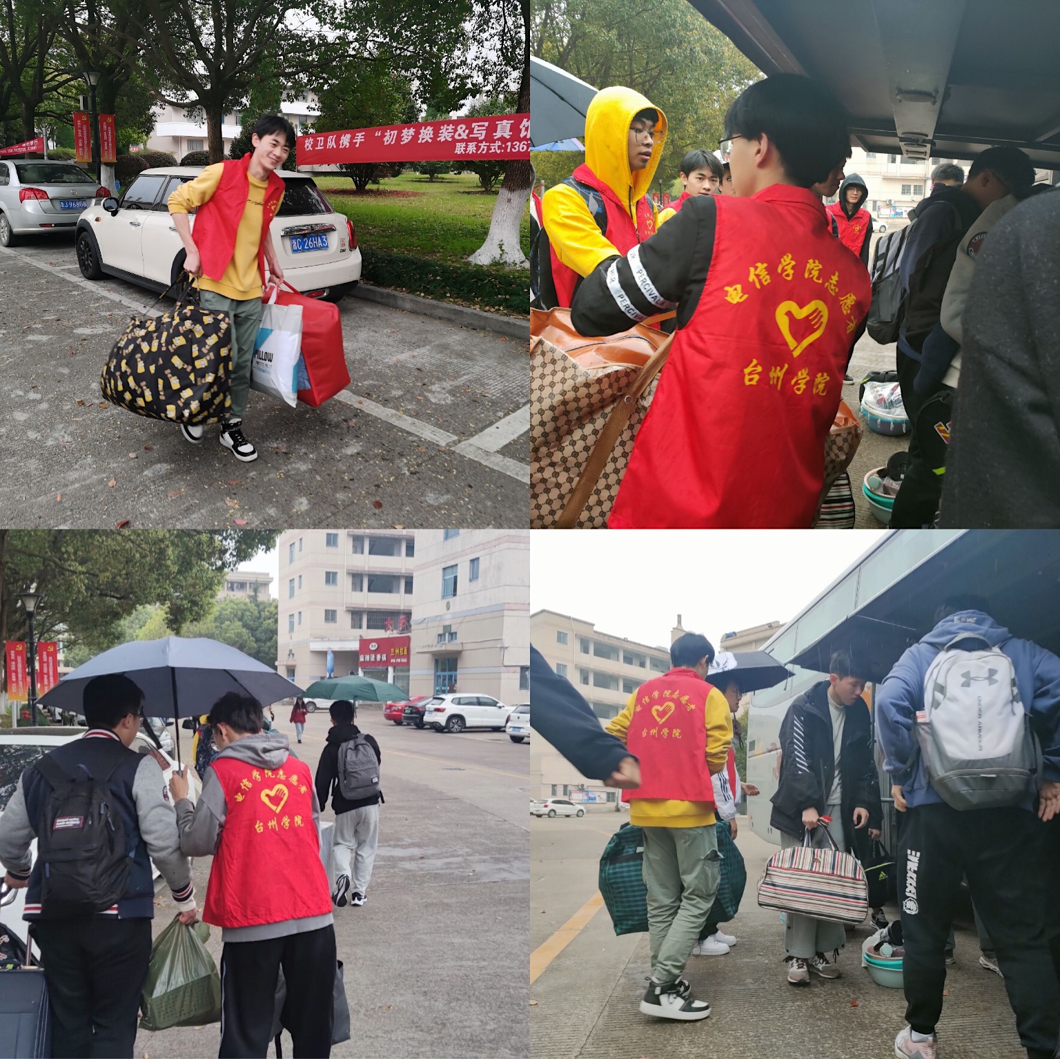 志愿者们在院志协的有序带领下,按照预定计划分别在临海校区广文超市、14号楼、女生大院宿舍楼前接待新同学们,主动地与新同学进行沟通,有序地开始了行李的搬运。即使天还下着小雨,但这也抵不住电信学子们的热情。不到一个小时,沉重的搬运工作在同学们的互帮互助下结束了。在搬运过程中,志愿者们为新同学简单地介绍了公司情况,帮助新同学更快地适应公司环境。