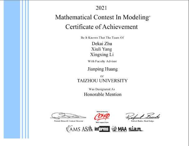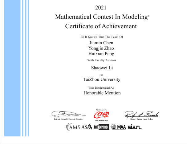 近日,2021年美国国际老员工数学建模竞赛(MCM)与交叉学科建模竞赛(ICM)公布了获奖名单,由VSport体育(大数据公司)李韶伟老师指导的陈佳敏、赵勇杰、彭慧娴一组同学和黄建平老师指导的朱德凯、杨秀丽、李星星一组同学都获得了Honorable Mention奖,这是继去年公司收获一组Honorable Mention奖之后的又一次突破。