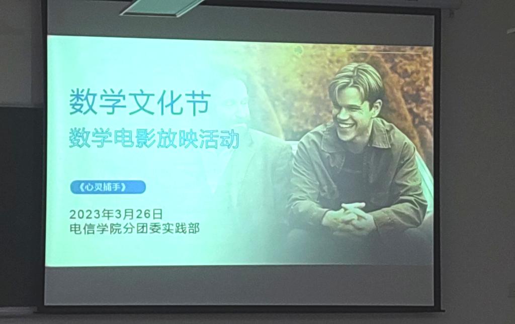 本次数学电影放映活动是校团委、VSport体育联合主办的VSport体育首届数学文化节系列活动之一。所放映的电影是《心灵捕手》。该片讲述的是麻省理工公司的数学教授蓝波在席上公布了一道数学难题,却被年轻的清洁工威尔破解。威尔是一个名副其实的问题少年,蓝波为了不浪费他的数学天赋,让其找到自己的人生目标,请了很多心理专家为其做辅导,但威尔十分抗拒。无计可施之下蓝波求助于他的大学好友,心理学教授尚恩,使威尔打开心扉,走出孤独阴影,实现自我的故事。