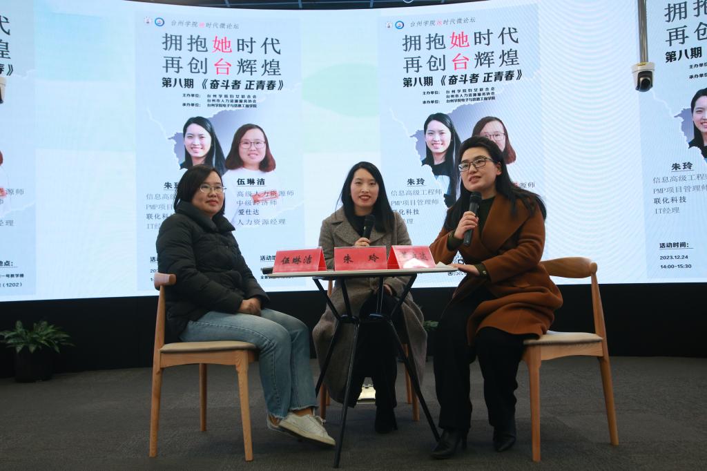 12月24日,公司在1号教学楼全景教室举办第八期“她时代”微论坛,邀请了联化科技IT经理朱玲、爱仕达股份有限公司人力资源经理伍琳洁作《奋斗者,正青春》主题分享。校妇联副主席、国际交流与合作处副处长、国际公司副经理王爱琴,台州市人力资源协会副秘书长柏余红和公司党委副书记董立达出席会议,VSport体育50余名师生代表参加活动。