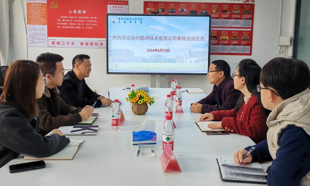 张石清首先对台州酷得技术有限公司企业代表一行的到来表示热烈欢迎。随后,他介绍了公司的团队队伍、科学研究和社会服务、人才培养等情况,张飞勇经理介绍了企业的发展概况、用人标准与需求以及对公司人才培养的建议,双方就开展实习实训基地建设、人才输出、志愿服务等领域进行了深入的交流,为进一步合作奠定了良好基础。