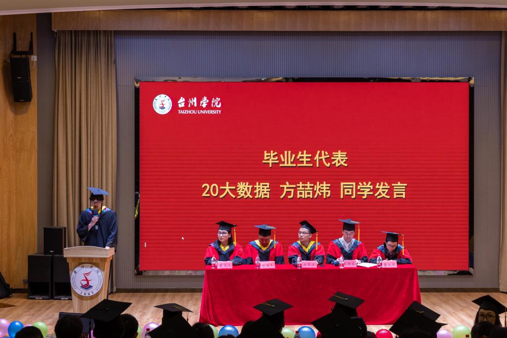 毕业生代表曾日威、方喆炜回顾四年大公司园生活,代表全体毕业生表达了对专业老师和辅导员的感激,对员工的留恋和对未来生活的期许。