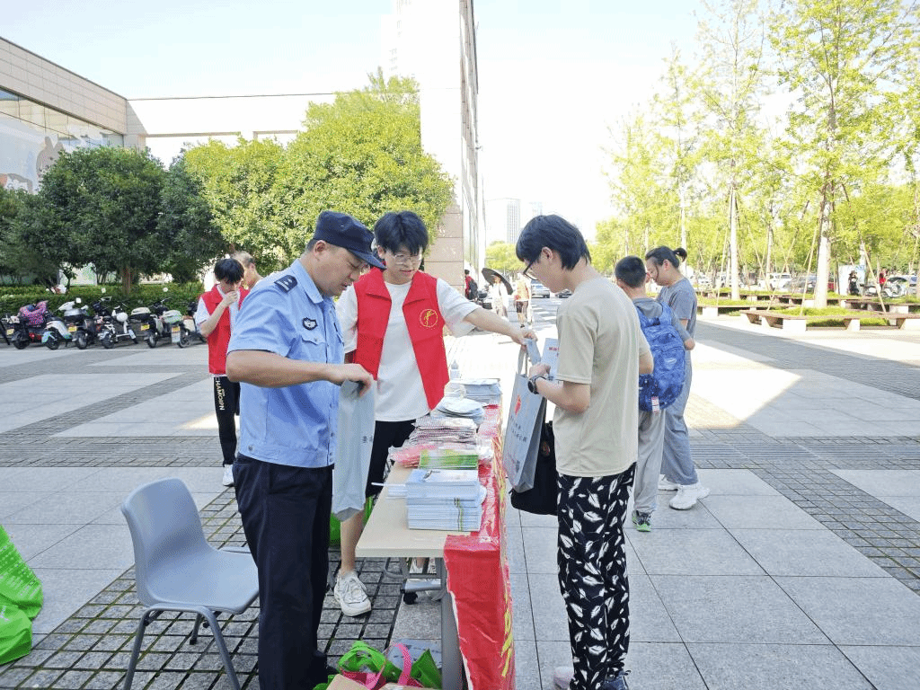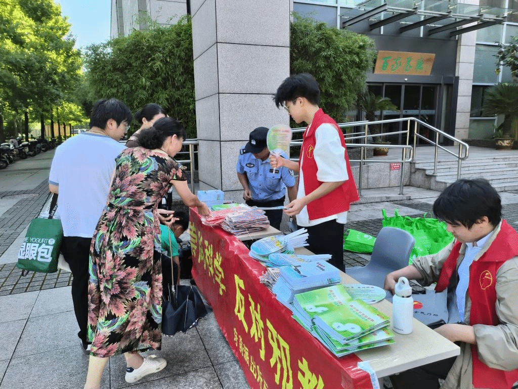 反邪实践队在府前派出所民警的协助下,于台州市图书馆门口设立了反邪宣传站。路过的市民纷纷停下脚步,积极参与到反邪宣传活动中。反邪队员们同市民亲切交流,为他们介绍反邪的相关知识,并赠送反邪小册和精美礼品,得到了市民们的一致肯定和夸赞。