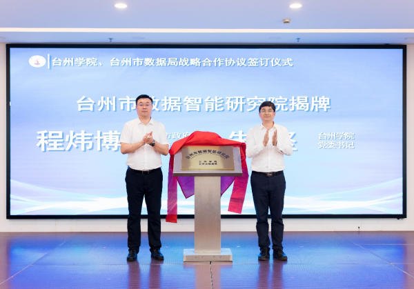 程炜博与朱坚共同为台州市数据智能研究院揭牌