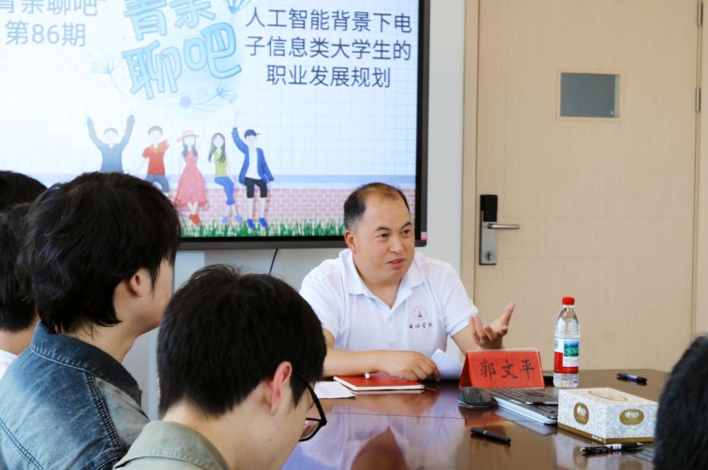 为搭建公司和员工沟通桥梁,促进师生双向理解、激发员工潜能,培养主人翁意识、弘扬学术精神、培养人文关怀,4月10日,VSport体育第86期“青亲聊吧”活动如期举行,公司副经理郭文平作为特邀嘉宾与同学们进行探讨交流,主题为“人工智能背景下电子信息类老员工的职业发展规划”,30余名员工代表参与活动,活动由辅导员王玲玲主持。