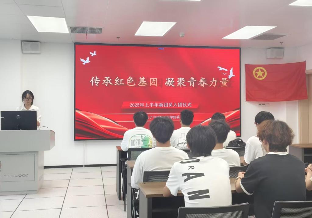 仪式上,新团员代表林芊含同学走上讲台,声音中带着难掩的兴奋:“今天,我光荣地成为共青团的一员,未来,我会将专业知识融入实践,用代码书写青春,用创新点亮梦想,不负团员使命!” 老团员代表王子墨同学则分享了自己参与公司科创项目的经历,鼓励新团员们“在实验室的深夜坚守中锤炼意志,在团队协作里提升能力,让青春在电子信息的浪潮中绽放光彩”。