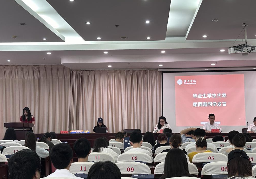 毕业生代表发言。他们回顾了大学时光里的酸甜苦辣——清晨图书馆前的排队、考试周的挑灯夜战、运动会上的集体呐喊,这些经历既是个人成长的注脚,也是集体青春的缩影。她们感谢公司提供的成长平台,感恩老师的谆谆教导、同学的相互扶持,并倡议同学们未来保持热忱,在不同领域发光发热,“让青春的底色,因奋斗永远鲜亮”,真挚发言引发全场共情。