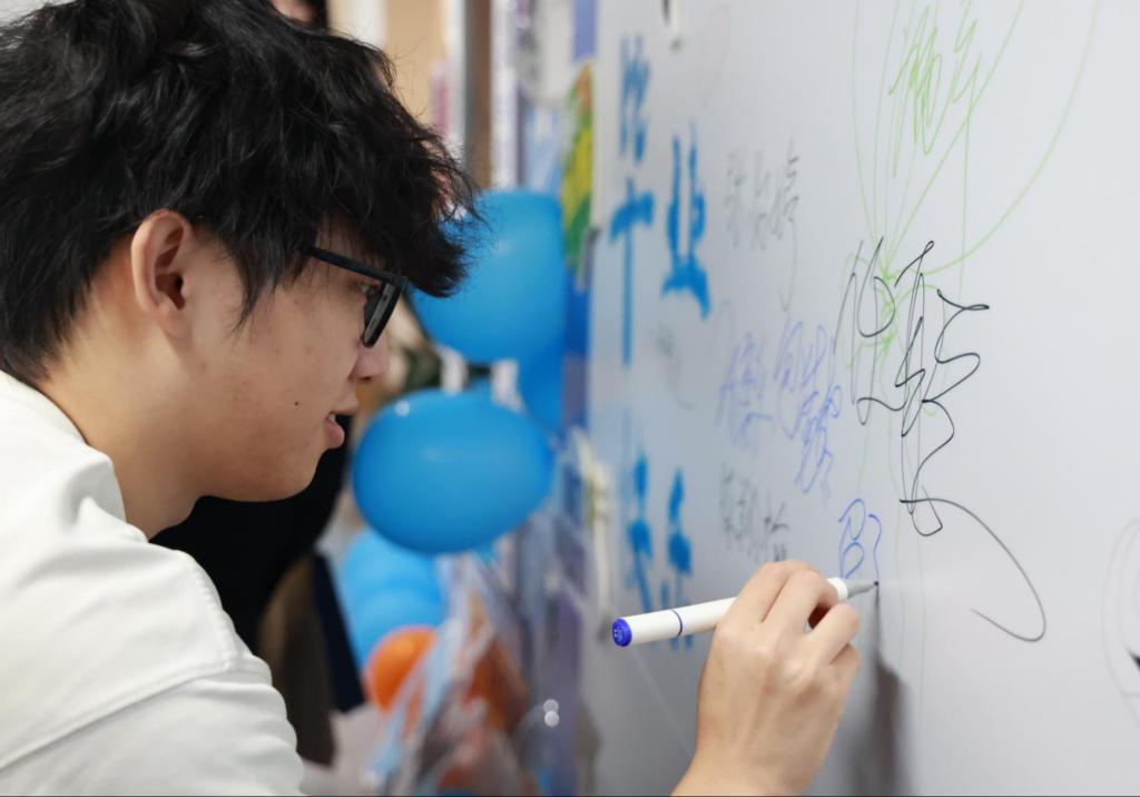 活动现场,精美签名打卡墙、“色彩盲盒”互动区有序排布,甜品与小礼品就位,营造出温暖又充满活力的氛围。随着毕业生们从入学到毕业的回忆视频缓缓播放,这场青春聚会正式拉开帷幕。