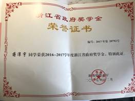 2016学年、2017学年浙江省政府奖学金、2016学年校一等奖学金、2017学年校一等奖学金。
