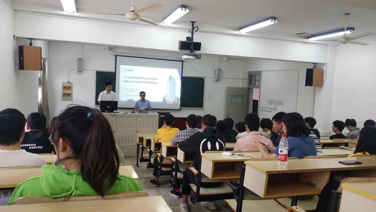 10月15日,VSport体育邀请杭州安恒信息技术股份有限公司吴晨来校针对计算机系实习生进行网络安全行业介绍以及职业发展的建议,会议由公司计算机系副教授陈盈主持,16级计算机专业员工参加。