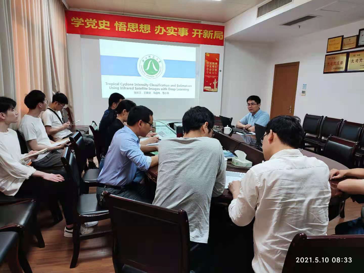 张长江教授是浙江师范大学“智能视觉与气象大数据”研究团队负责人和浙江省高校“智能信息处理”创新团队骨干成员,长期从事图像处理、多尺度几何分析、人工智能及其在医学、气象等领域的应用研究。本次报告会上,张教授主要介绍TCICENet模型:利用西北太平洋静止红外卫星图像提出一种级联卷积神经网络模型用于热带气旋分类定强。所提出的模型由两个模块组成:热带气旋强度分类模块(TCIC)和热带气旋强度分类模块(TCIE)。刘华文教授则主要介绍了一种新的稀疏思想,该方法的优势在于它不仅可实现稀疏学习,而且是无参的,从而免除参数设置困恼。为了验证所题思想的有效性,将其应用于多标签学习和哈希学习应用场景,并取得了较好的效果。罗文昌教授主要研究领域为数学/运筹学/组合优化,研究方向为近似算法设计与分析及运筹优化建模,在指导本科生/研究生参加数学建模竞赛方面有丰富的经验。在报告会上,罗教授首先给出了一种基于动态规划的伪多项式时间精确算法,然后提出了一种全多项式时间近似方案。