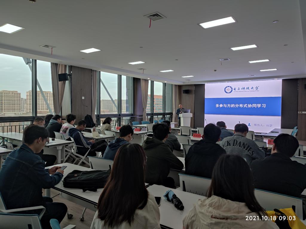 孙罡教授长期致力于智慧网络相关技术研究,近五年,主持/承担国家自然科学基金面上/青年、国家重点研发计划、国家863计划、装备发展部预研基金、军委科技委前沿创新等国家级项目11项,企业横向项目10余项。本次报告会上,孙教授作题为 “多参与方的分布式协同学习”的学术报告。随着物联网大数据时代的来临,数据的采集速度和积累量爆炸式增长。对于数据驱动的人工智能技术而言,海量数据为训练高质量的机器学习模型提供了基础。但这些海量数据像粉尘一样散布在各个机构,从而形成了严峻的数据孤岛现象。因此,解决数据孤岛困境下的高质量模型训练是机器学习技术未来发展中亟待解决问题。
